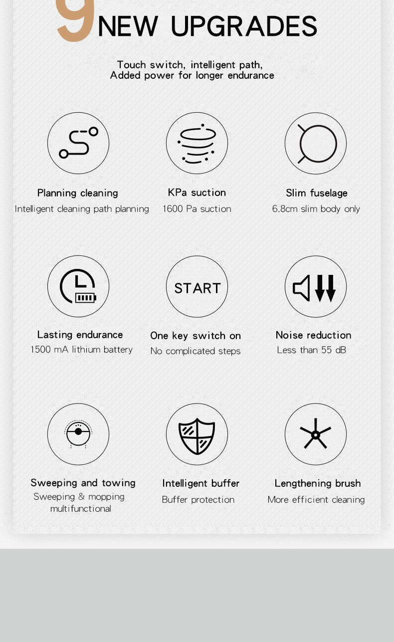 Haz que la limpieza diaria sea más fácil, rápida y sin esfuerzo con este Robot Aspirador Inteligente, diseñado para dejar tus pisos relucientes mientras tú disfrutas tu tiempo. Su tamaño compacto y ultradelgado le permite deslizarse sin dificultad bajo muebles, alcanzando rincones que normalmente pasan desapercibidos.